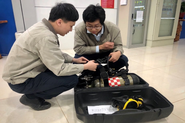 培訓中,培訓員重點對正壓式呼吸器的工作原理、使用前常規檢查及日常維護保養等內容進行了耐心細致地講解,并現場示范了呼吸器的正確配戴和使用方法,確保參培員工熟練掌握救生器材的使用技巧。