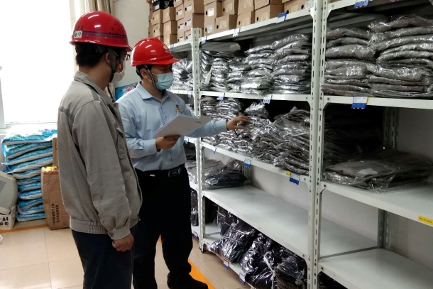 圖為該公司人員正在檢查職業危害防護用品配備情況