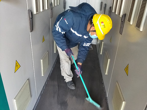 該電站毗鄰當?shù)貫跆m布和沙漠,廠址周邊植被少,冬季多為大風天氣,為防止光伏板被風吹落,該公司運維人員對光伏組件基礎進行細致檢查,對相對薄弱的區(qū)域進行埋石填土加固,對組件支架銹蝕的螺栓及時進行更換,對傾斜的立柱進行校正固定;站內防凍措施已提前落實,但隨著氣溫的降低,相關防護需要每日一檢,該公司運維人員對生活水井的保暖措施進行再加固,在井蓋上方罩住多層保溫被,隔離井口積水,為閥門制作防護罩,保證生活用水正常供應,同時對電暖氣和空調開展全面檢查,對用電負荷電流進行鉗測,避免過負荷故障和火災事故;在主設備風沙防治上,這群年輕人狠下功夫,他們每天在太陽下山前開好工作票,在太陽下山后做好安全措施,集中清掃逆變器室和箱變室塵土和更換濾網,每日清掃一組,一個月一輪回,解決逆變器及箱變積沉較多、散熱不良問題;在送出線路檢查上,他們每日對17條站內線路和1條送出線路進行徒步巡線,細致檢查桿塔金具、導線、地線固定情況,并利用夜間停電機會及時消除異常隱患,保證涉網設備正常運行。