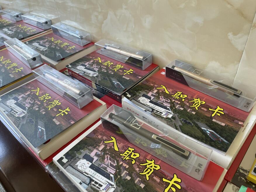 活動現場,該公司領導為新員工發放“入職賀卡”“入職學習大禮包”并與他們合影留念。(周佩)