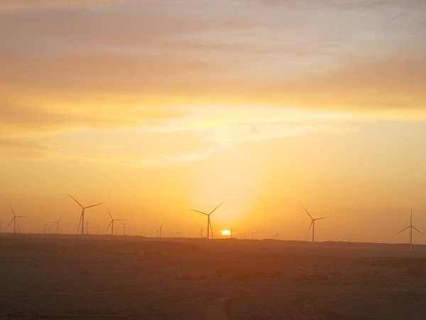 茫茫的戈壁灘,視野盡頭,是一條天地交接的分割線,成百上千的“大風車”(風力發電機組),一排排旋轉的風機擎天而立、迎風飛旋,與藍天、白云相襯,蔚為壯觀,巨大的葉片在風中緩緩轉動劃出優美的弧線,我贊嘆不已,拿起手機,拍下了這獨有的“風景”。
