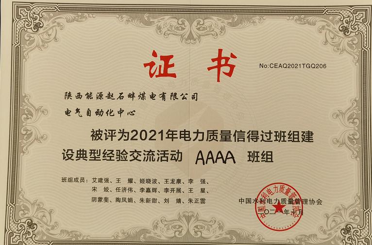 中國電力網訊 10月11日至10月15日, 2021年電力行業質量信得過班組建設交流發布會在合肥召開,陜投集團趙石畔煤電設備部電氣自動化中心被評為“電力質量AAAA級質量信得過班組”。