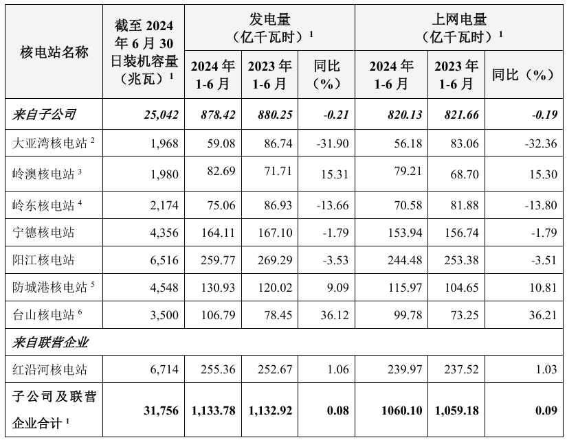 中國廣核公告披露2024年第二季度運營情況,2024年1月至6月份,中國廣核及其子公司運營管理的核電機組總發電量約為1,133.78億千瓦時,較去年同期增長0.08%。總上網電量約為1,060.10億千瓦時,較去年同期增長0.09%。