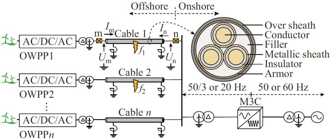 圖1給出了海上風電低頻輸電系統拓撲,海纜需匯集來自于風電場的電能,并經模塊化多電平矩陣換流器(modular multilevel matrix converter,M3C)實現頻率轉換,從而在M3C低頻側構成了100%電力電子源場景。相較于同步機系統在負序網絡中源側只體現阻抗特性,低頻輸電系統負序網絡中線路兩側均可體現為電源特性。根據單相接地故障和兩相相間故障復合序網圖,故障支路電流可由負序電流唯一確定,當M3C和海上風電場網側變流器(grid-side converter, GSC)抑制負序電流時,盡管故障點處存在負序電壓源,但兩側換流器均會生成幅值相位相同的電壓源,以抵消系統中的負序電流,因此系統故障電流仍保持對稱,使得故障支路的穩態電流為0。上述分析表明,雖然風電場升壓變壓器和M3C低頻側隔離變壓器網側中性點均采取直接接地方式,但低頻輸電系統在特定故障控制策略下呈現出類似于中性點非直接接地系統的故障特征。