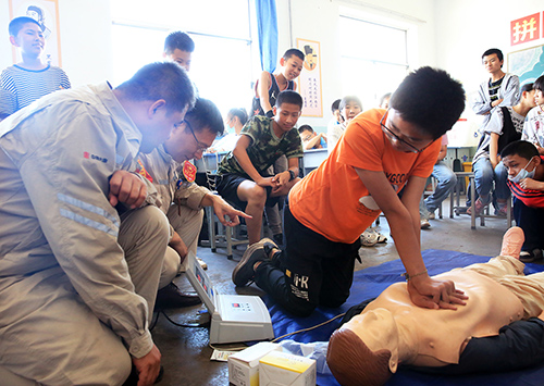 活動現場,青年志愿者給孩子們發放了安全環保宣傳手冊及宣傳單,給孩子們認真講解交通安全、消防滅火和生活中的安全防護知識,緊緊圍繞“落實安全責任、筑推動安全發展”主題,為孩子們進行“面對面、零距離、互動式”宣講、普及、解答有關應急救援知識。并借助橡皮人給孩子們培訓心肺復蘇急救知識,詳細講解操作流程和注意事項,指導孩子們親自上手操作實踐,提升孩子們的應急防護能力。該公司團委書記給孩子們講黨史、新中國史、改革開放史和社會主義發展史“四史”微團課,現場教孩子們學唱《強國一代有我在》愛國歌曲,鼓勵孩子們熱愛祖國、努力學習,砥礪奮進,勇敢追夢。