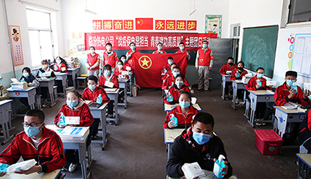 臨汾熱電公司青年志愿者扛起專用消毒工具和噴壺,和老師們一起,將汾河學校“大唐班”教室和樓道公共設施區域進行全方位無死角衛生消毒,為即將復學復課的學生營造安全放心的學習環境。