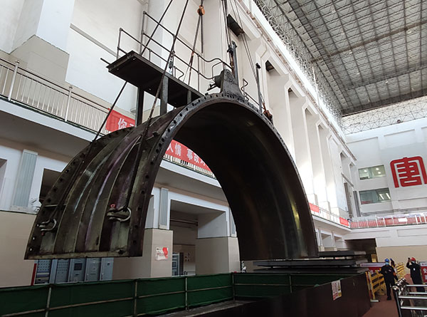 該公司密切關注本次轉輪室吊裝作業,2號機組轉輪室上半部重約16噸,為確保本次吊裝工作的順利進行,該公司根據現場情況,對參與本次吊裝工作的全體人員進行安全技術交底,所有工作人員清楚工作內容、方法和要求。同時監督吊裝作業各項措施全部落實到位,明確各項責任。在吊裝過程中,工作負責人和橋機指揮人員密切關注轉輪室擺動幅度,及時進行方位調整,各部位設專人負責,各環節做到無縫銜接,最終圓滿完成了2號機組轉輪室上半部吊裝工作。