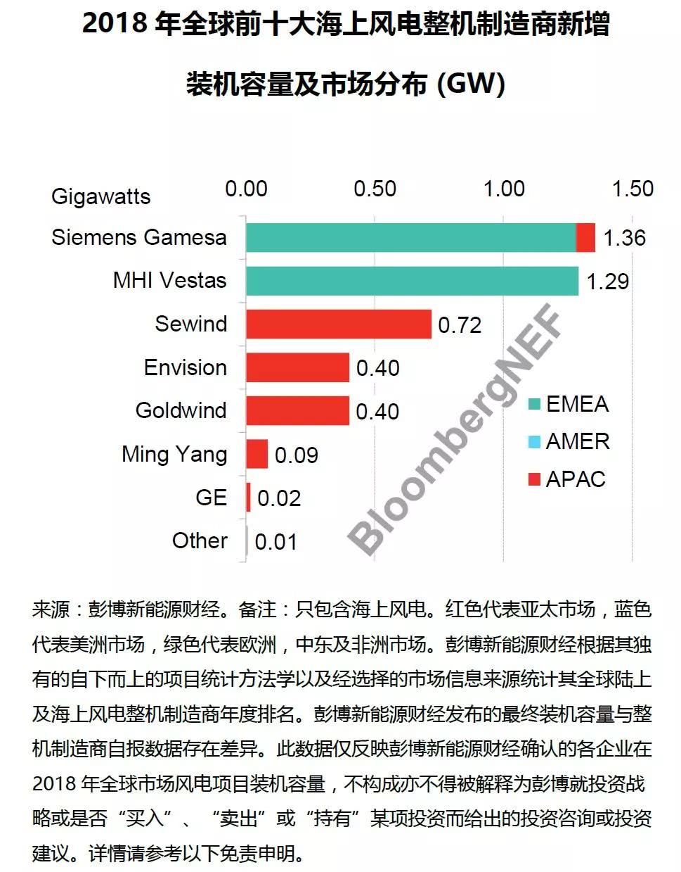 Siemens Gamesa2018年全球海上風電新增裝機容量為1.36GW,市場份額達32%,繼續領跑全球海上風電市場。