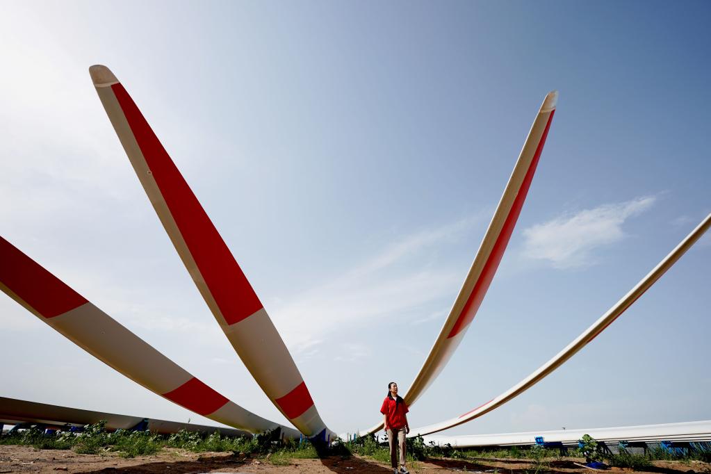 6月30日,河北省威縣一家風電機組葉片制造企業工人對大型風電機組葉片進行外觀檢測。新華社記者 駱學峰 攝