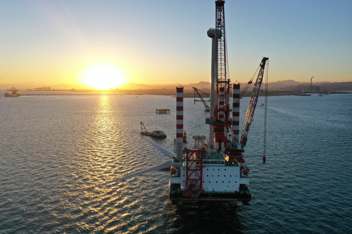 福建福清興化灣二期三峽海上風(fēng)電場10兆瓦風(fēng)機(jī)吊裝現(xiàn)場(無人機(jī)照片)。新華社記者 林善傳 攝(2020年6月12日攝)