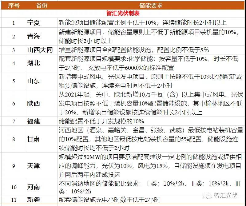 對于由電網承擔消納任務的保障性規模,部分省份也要求配一定能比例的儲能。根據各省的競爭性配置文件,大部分省份的保障性規模儲能配置要求為10%功率、2小時,如下表所示。
