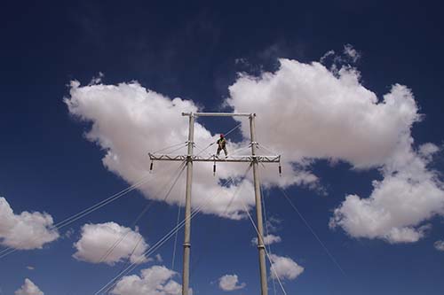 項目架空線路桿塔共計668基,12種桿塔型式。桿塔是在35kV架空線路架設,線路總長度約122.21km,塔高為15-21米,屬于高空作業。施工現場干旱炎熱,沙塵暴和冰雹也常常輪番“光顧”,給施工進度和安全管理帶來不小的挑戰。在桿塔組立作業前,項目部組織協作隊伍召開專題安全會,施工隊長徐少帥堅持對現場的施工操作人員進行詳細的安全、技術、質量交底工作;質量安全科林周彬堅持每天現場巡查,要求高空作業人員必須持證上崗,且具有合格的體檢報告;施工過程中,施工現場拉起安全警戒線、懸掛安全警示標識,安全員全程旁站監督,確保現場施工安全質量可控。