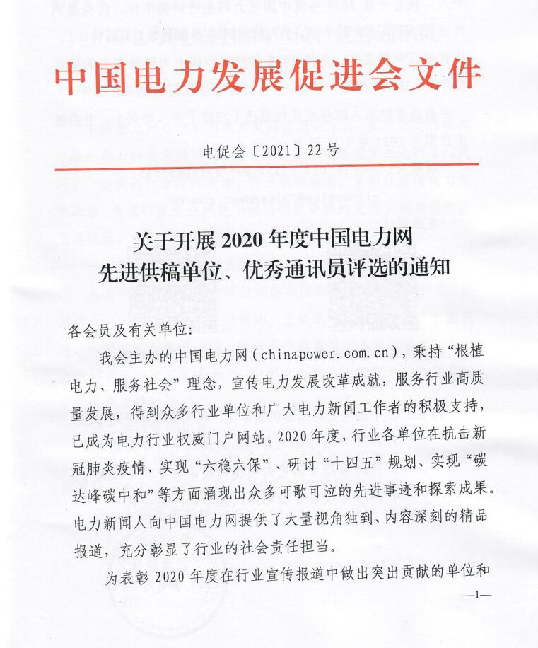 關于開展“中國電力網2020年度先進供稿單位、優秀通訊員”評選活動的通知