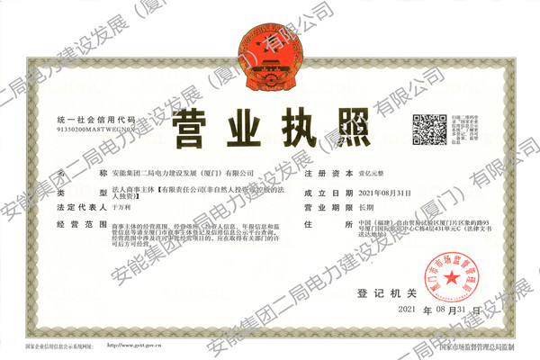 中國電力網訊 8月31日,中國安能第二工程局電力建設發展(廈門)有限公司順利完成工商登記并取得營業執照。