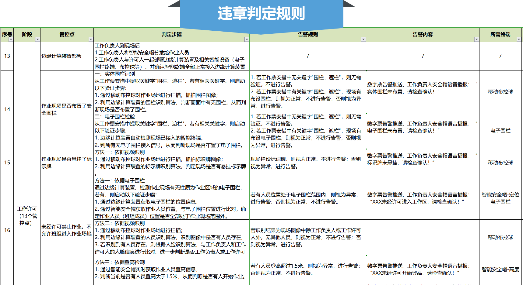 數(shù)字化安全管控判定規(guī)則是業(yè)務(wù)與科技融合的靈魂。在國網(wǎng)安監(jiān)部和國網(wǎng)浙江電力公司的指導下,國網(wǎng)信通產(chǎn)業(yè)集團項目組深入輸、變、配一線班組調(diào)研,圍繞“四個管住”,全面梳理典型違章案例與安規(guī)標準內(nèi)涵,結(jié)合數(shù)字化工作票,設(shè)計形成《數(shù)字化安全管控違章判定規(guī)則》和118項風險管控點,以技術(shù)手段彌補傳統(tǒng)安全管控存在的不足,為數(shù)字化安全管控的設(shè)計研發(fā)奠定業(yè)務(wù)基礎(chǔ)。