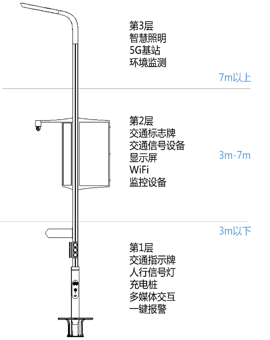 中電啟明星所開發的智慧路燈主要采用模塊化分層級的桿體設計,將路燈桿體分為頂部(>7米)、中部(3-7米)、下部(<3米)三個層次: