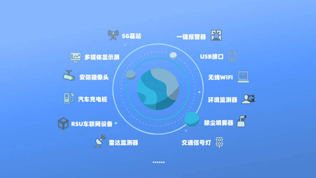 在不同高位層次里規劃部署相應的智能化設備,包括但不限于5G基站、多媒體顯示屏、安防攝像頭、交通信號燈、充電樁、一鍵呼叫等數十類設備。每一層次里的設備都可靈活更換、拆卸;桿體內匹配相應的電容器和智能斷路器,在配電側整合強弱電機柜,安裝智能門鎖、溫度監測,實行低壓供電,分級控制,充分滿足個性化的場景應用需求。