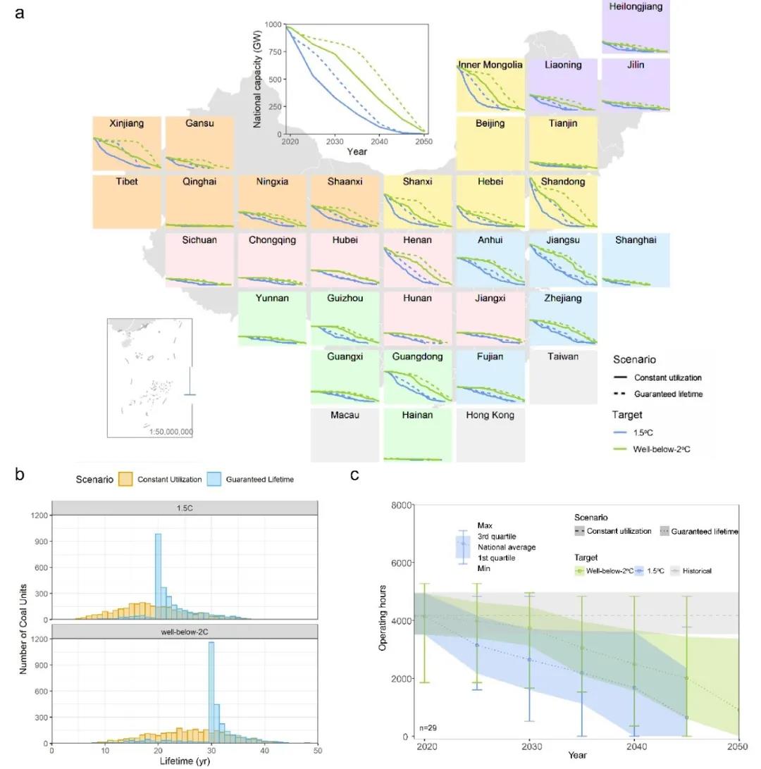 基于這套系統性的煤電機組退出策略,以及與1.5°C和2°C目標相匹配的煤電機組退出路徑,研究者們設計并分析了兩種電廠退役情景——保持機組利用小時和保障機組運行年限(圖2a)。在保持機組利用小時的退役情景下,在全國煤電發電量的約束下,每個機組的退役時間則是根據其多指標退役優先級逐個關停,大多數機組將在達到20 或30 年的保障年限之前退役(圖2b)。