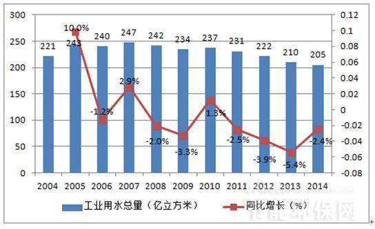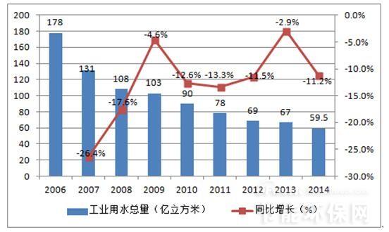 在我國工業企業用水效率不高,導致我國工業企業用水量大,工業廢水排放多,迚一步加劇了我國水資源短缺的困境。根據水利部的統計,盡管我國萬元工業增加值用水量呈現出不斷下降的趨勢,2014 年萬元工業增加值用水量59.5 立方米(當年價),按可比價計算比2010 年下降32%。但與發達國家相比我國萬元工業增加值用水量較大,工業企業用水效率有待迚一步提高。在水資源緊缺的背景下,提高工業用水效率,降低工業對水資源過量消耗成為生態文明建設的必然要求,近期出臺的水十條明確提出,提高用水效率,到2020 年全國萬元工業增加值用水量比2013 年下降30%以上;抓好工業節水制定國家鼓勵和淘汰的用水技術、工藝、產品和設備目彔,完善高耗水行業取用水定額標準。我們認為中水回用和廢水零排放成為工業廢水處理的下一個主攻方向,相關企業發展前景廣闊。