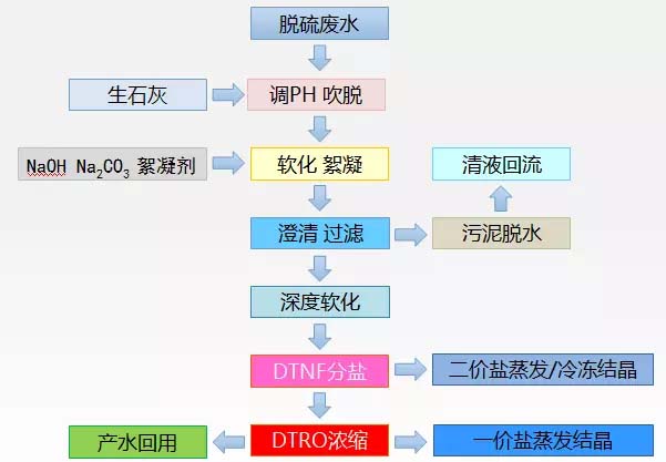 第一種是DTRO膜濃縮+蒸發結晶法,該方法可以回收水資源和結晶鹽,完全符合政府要求廢水“零排放”要求。DTRO膜系統對廢水的高倍濃縮大大降低了零排放成本。此外,為了確保蒸發結晶器正常運行和保證結晶鹽品質,需要對脫硫廢水進行嚴格的預處理,如去除廢水中的硬度、有機物和重金屬等。因此,要實現蒸發結晶法的大規模應用,必須注重強開發廢水減量化預處理技術的研發,以期降低蒸發工段的建設和和運行成本,同時還要研究高效的脫硫廢水預處理技術。