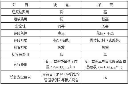 兩種還原劑在安全性和經濟性上各有優勢,采用尿素作為還原劑是比較安全的,但初期投資造價高,運行費用也高;采用液氨作為還原劑,相對初期投資造價低,運行費用低,但液氨作為重大危險源,在運輸和儲備時存在一定的安全隱患,在運輸成本上以及在生產安全管理上對電廠的運行水平要求較高,存在一定的危險性。因此從經濟或運行維護成本考慮,還原劑可以選擇液氨,但從安全角度考慮,則應選擇尿素,中能自備電廠綜合考慮各種因素最終選擇尿素是較好的選擇。