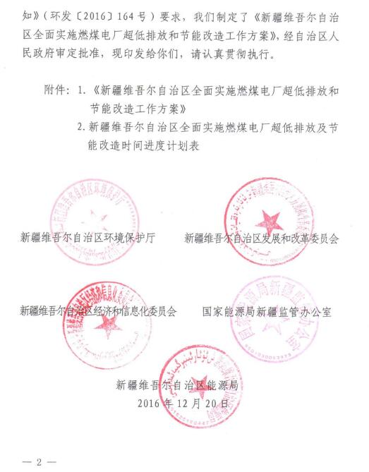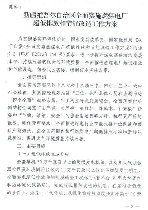新疆自治區環保廳、發改委、經信委、國家能源局新疆監管辦、能源局關于印發《新疆維吾爾自治區全面實施燃煤電廠超低排放和節能改造工作方案》的通知(新環發[2016]379號)已經印發。方案提出,全面推進煤電行業節能減排升級改造和落后產能淘汰,在全區范圍內實施燃煤電廠超低排放標準和新的能耗標準。方案要求,全疆30萬千瓦及以上燃煤發電機組,以及各大氣聯防聯控區及環境同治區域內10萬千瓦及以上自備燃煤發電機組,全面實行超低排放和煙氣脫硝全工況運行(咱不含W型火焰鍋爐和循環流化床鍋爐)。全文如下: