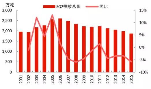 SO2的排放量為1859萬噸,每年基本以4%左右的速度下降,而收關年2015年下降速度高達5.84%;