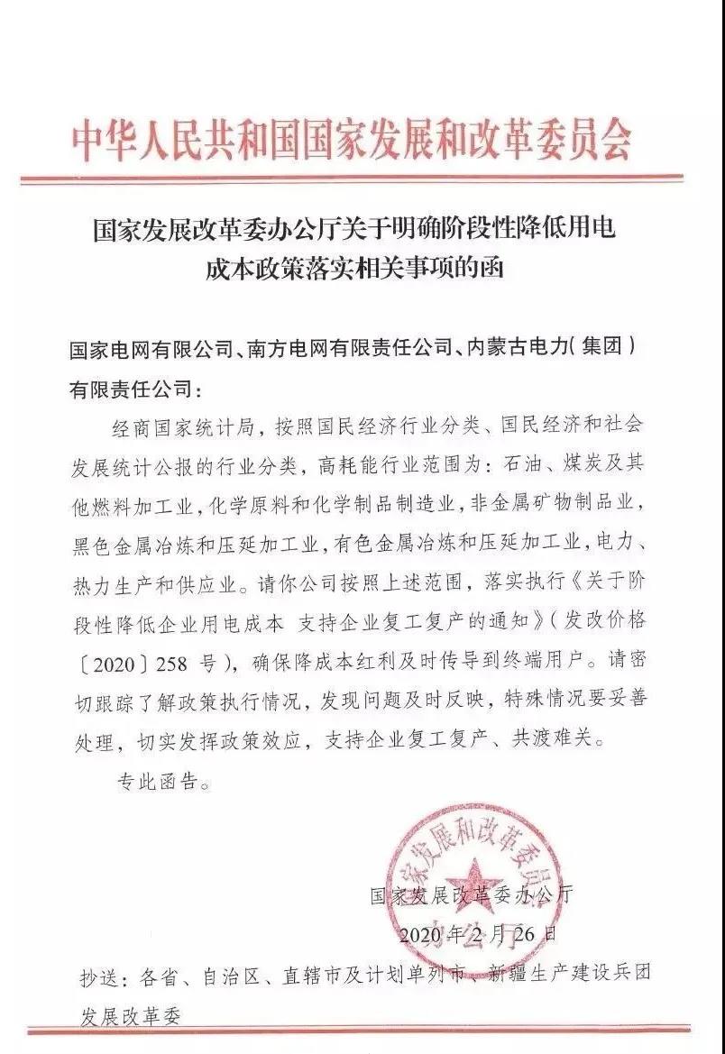 近日,國家發展改革委印發《關于明確階段性降低用電成本政策落實相關事項的函》,函件中進一步明確高耗能行業范圍為:石油、煤炭及其他燃料加工業,化學原料和化學制品制造業,非金屬礦物制品業,黑色金屬冶煉和壓延加工業,有色金屬冶煉和壓延加工業,電力、熱力生產和供應業。除以上行業外的工業用戶及全部商業用戶可享受電價95折優惠。