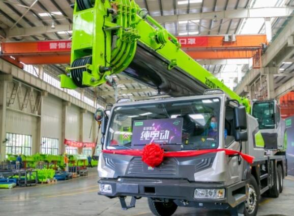 5月7日,一臺25噸極光綠純電動汽車起重機在長沙中聯重科泉塘工業園下線。這是全球首臺純電動汽車起重機,被譽為工程機械版“特斯拉”。