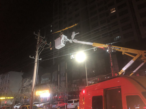 在應急搶修燈的照明下,絕緣斗臂車絕緣臂緩緩升起,作業人員緩緩向作業點靠近,由于是夜間帶電搶修,作業能見度等條件較為不足,工作負責人不敢有一絲大意,嚴密監護作業人員的行為。兩名帶電作業操作人員站在10多米高空的作業斗內,小心翼翼的包絕緣毯,套絕緣管,更換燒壞的熔斷器……一道道作業流程嚴謹有序,經過3個半小時的連續搶修,故障搶修順利結束,受損線路恢復供電。