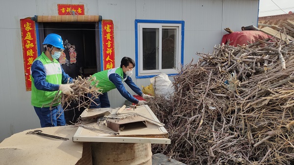 志愿者首先對老人家中用電設備和線路進行了檢查,通過檢查發現接戶線老化嚴重,部分絕緣層已經破損,存在一定安全隱患。發現該情況,志愿者立即與烏力吉營業所溝通,準備工器具和導線為其重新更換接戶線,消除了安全隱患。隨后,志愿者來到老人家院外,幫助她撿拾樹枝,劈開后送到院內充當柴禾,并幫老人對小院子進行了打掃。最后志愿者為老人送上米面油等生活用品和真摯的祝福。