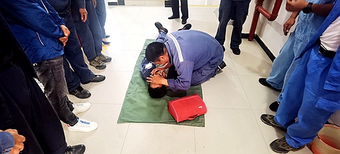 演練模擬大寺鄉發生6.5級破壞性地震,供電所辦公樓開始搖晃,指揮長嚴世莊大聲呼喊吹哨,各樓層內所有人員立即采取正確的避震措施,迅速抱頭尋找最近的墻角、柱角、堅固高大的桌下、柜旁或開間小的衛生間、內承重墻墻角蹲下、抱頭、閉眼,抓牢或握實以盡量固定身體,使用安全帽等保護頭部,降低身體重心。隨著指揮長第二次呼喊緊急撤離,各樓層緊急組織人員安全迅速從安全指定安全通道疏散到指定聚集點,過程中員工互相呼喚、提醒避震。撤離后清點發現1人失蹤,急救組立刻對失蹤人員進行搜救,搜救人員在二樓辦公室發現失蹤人躺在地上,左手臂被傾倒的辦公桌壓住,造成骨折,同時發現兩根0.22KV電線(鋁塑線)達在傷員身上,并正通有電源,傷員無意識,心跳呼吸停止同時發生人員觸電,搜救人員立即斷開有關電源,用木棒挑開電線,迅速轉移傷員至安全地帶后對其進行心肺復蘇和外傷急救,并撥打120急救電話。經全力搶救,傷員已恢復自主心跳和呼吸,搶救人員對其進行外傷包扎后就地觀察,等待120急救人員到來,同時有人員報告一樓安全工器具室發生火災,指揮組迅速組織人員對著火點進行滅火器滅火。