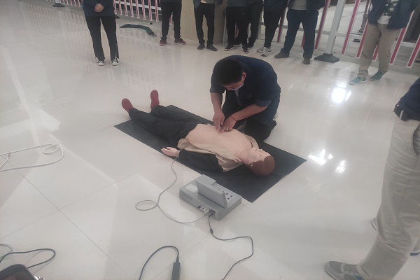 隨后,大家利用模擬人依次進行了心肺復蘇搶救實訓。實踐過程中,實訓儀器不時的發出錯誤提示音,有的胸外心臟按壓用力過猛,有的吹氣手法錯誤,氣量過小,還有的動作頻率過慢……。經過李燾的一一指正,通過反復練習,所有人員都成功完成了心肺復蘇搶救演練。