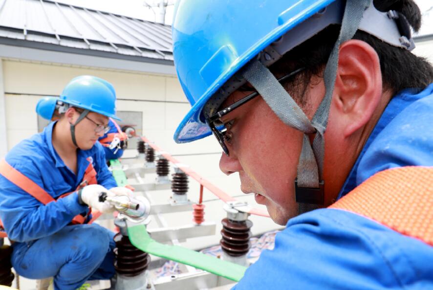 中國電力網訊 8月12日,安徽省定遠縣二龍回族鄉中湯村,國網定遠縣供電公司新建35千伏二龍變電站項目正在緊張施工中。當日,攝氏33°高溫下,2臺主變壓器臺上,瓦斯噴燈的火苗呼呼作響,高空作業人員渾身汗水濕透,正在對母線鋁排進行絕緣化處理。變電站控制室內,專業技術人員二次側安裝調試正在同步進行。