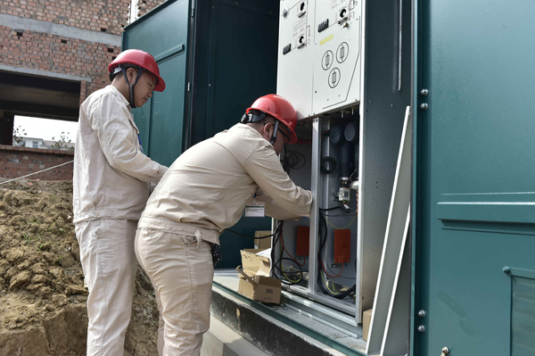 9月22日,江蘇連云港東海縣供電公司施工人員在石梁河鎮南辰城鄉融合配網工程安裝500千伏安箱變。