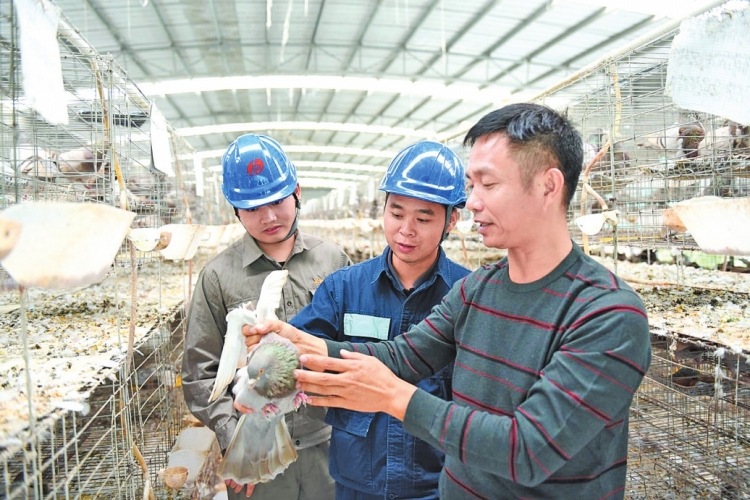 廣西新電力投資集團博白縣公司工作人員了解鴿子養殖扶貧車間用電需求。向建軍 攝