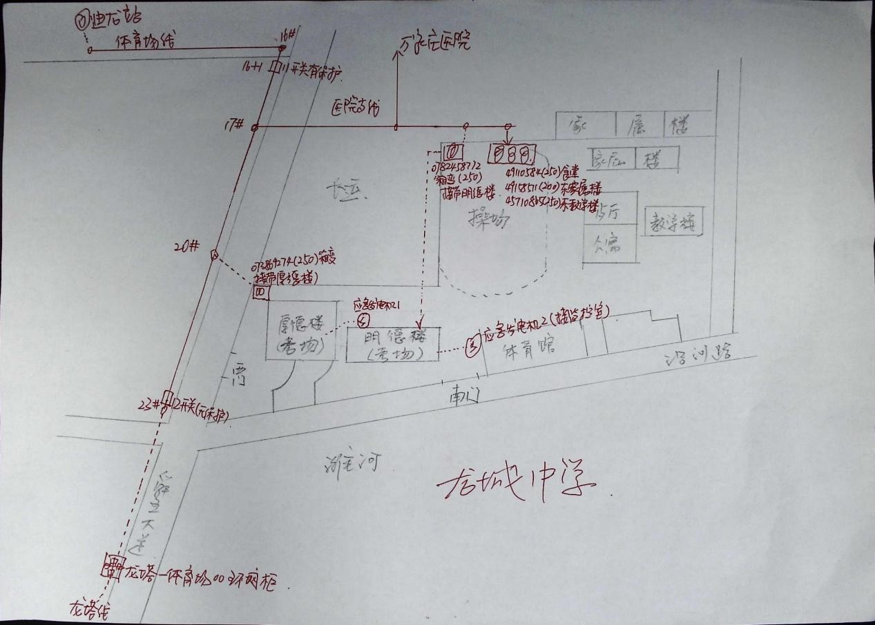 諸城市龍城中學(xué)建校于1998年,隨著學(xué)校的發(fā)展,校園規(guī)模逐步擴(kuò)大,供電變壓器也越來越多,且較為分散。該用戶現(xiàn)有配變5臺(tái)、總?cè)萘?200千伏安,電源全部來自110千伏迪龍站10千伏體育場(chǎng)線。對(duì)此,該校用電出現(xiàn)了電源點(diǎn)單一、供電可靠性相對(duì)不高,配變數(shù)量多且分散的特殊情況。為了熟練掌握龍城中學(xué)供電基本情況,確保高考保供電萬無一失,該公司舜王供電所工作人員多次現(xiàn)場(chǎng)勘查,手工繪制了該校區(qū)的供電網(wǎng)絡(luò)平面圖。該圖簡(jiǎn)要繪制了龍城中學(xué)的建筑平面布置圖,標(biāo)明了考場(chǎng)等重要負(fù)荷位置;涵蓋了龍城中學(xué)高壓電源走向圖、線路結(jié)構(gòu)和標(biāo)明T接點(diǎn)位置;明確了用戶5臺(tái)配變的分布位置和供電區(qū)域;綜合考慮接入線路和噪音影響,明確了供電公司保供電應(yīng)急發(fā)電機(jī)的安裝和接入位置等。