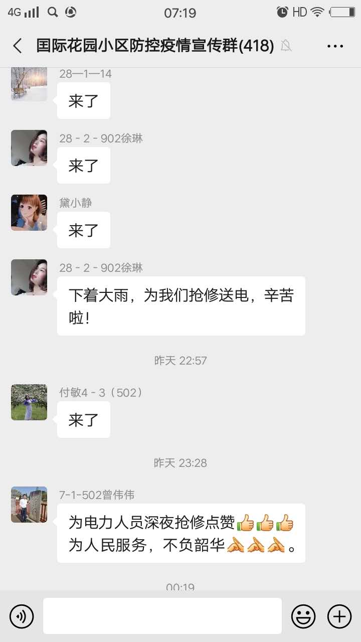 中國電力網訊 客戶又一次在微信群里表揚國網南豐縣供電公司搶修人員“為人民服務,不負韶華,”并為他們點贊。