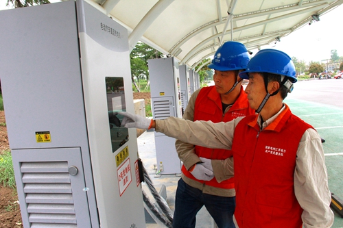 中國電力網訊 5月13日,江蘇連云港市東海縣供電公司駝峰供電所服務人員趙孫華、何文軍在縣開發區花卉市場門前檢查電動汽車充電樁運行情況。