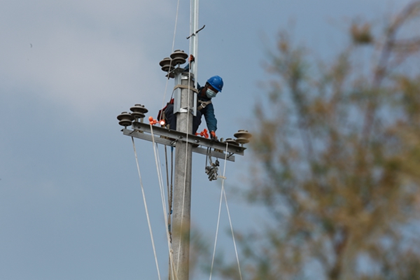 近日,在文家街道西河村,電力工作人員正在架設導線,將用電量超負荷的逢源線進行割接,通過將線路延伸從而解決一部分用戶的用電低壓問題。