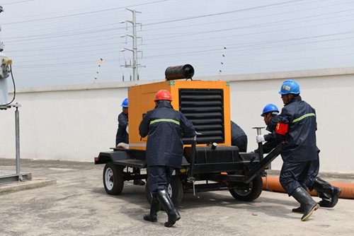 在接到變電站汛情通知后,在副總經理于躍指揮下,變電運維人員迅速行動,按照防汛應急預案,組織三隊人員攜帶必備工具趕赴防汛現場110千伏濱河變電站。運維人員分成排水組、封堵組、巡視組,各負其責并立即行動。排水組啟用應急照明設備,布置抽水管到排水井中,將水排至站外;封堵組檢查變電站周圍有無進水點,設置防汛隔離帶并用沙袋封堵變電站大門;巡視組利用無人機照明攝像,巡視全站屋頂是否有漏雨現象。隨著防汛人員匯報變電站設備運行正常,站內積水全部排出,險情成功解除。