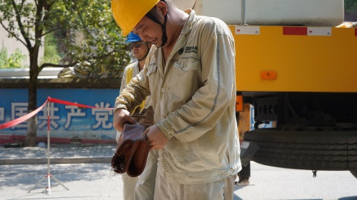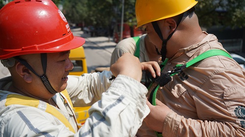 “帶電作業的方法有三種,分別是中間電位作業法、地電位作業法以及等電位作業法,今天我們采用的中間電位作業法。今天天氣不錯,雖然溫度高,但濕度低,能夠滿足帶電作業條件。帶電作業必須身著密不透風的絕緣套裝,在高溫下,作業人員體感往往會達到60℃。雖然辛苦,但只要能少停電,盡可能的給人民群眾帶去清涼,再苦再累都值得。”帶電作業班班長張敏說道。