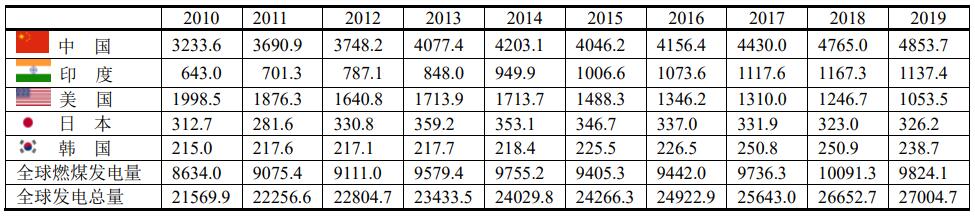 世界上燃煤發電最多的國家依次為中國(占全球燃煤發電總量的4853.7/9824.1=49.4%)、印度(1137.4/9824.1=11.6%)、美國(1053.5/9824.1=10.7%)、日本(326.2/9824.1=3.3%)、韓國(238.7/9824.1=2.4%)。這五個國家占全球燃煤發電總量的77.4%。就2019年中國燃煤發電量4853.7 TWh占全球發電總量27004.7 TWh=18%。