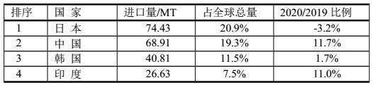 2020年全球LNG進口量達356.12 MT。LNG進口最多的前4位國家如表,表明仍然是日本LNG進口量最多,但中國LNG進口增幅最大的。
