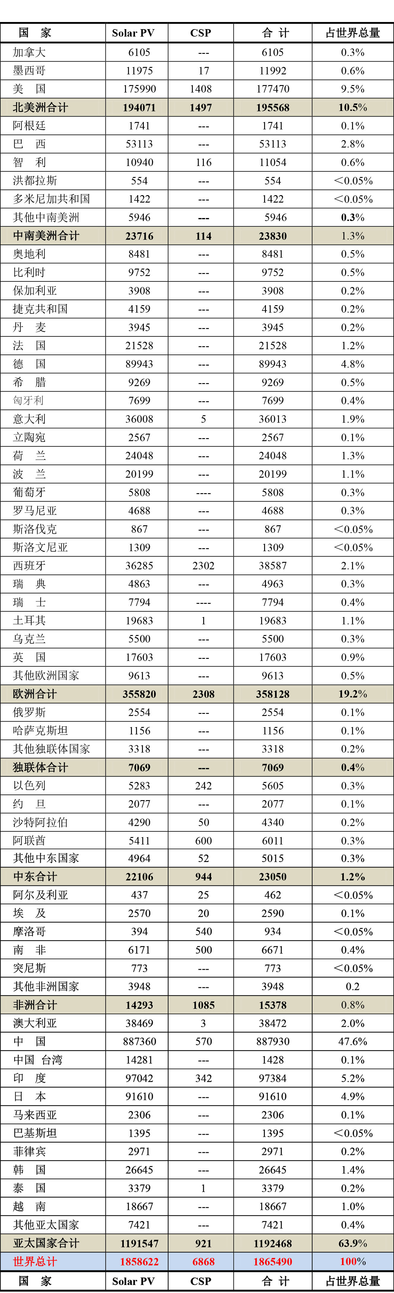 本文單位:MegaWatts, 即兆瓦。下表Solar PV為光伏發(fā)電,CSP為聚焦式太陽能發(fā)電。