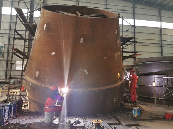 河南天池抽水蓄能電站鋼岔管為加強月牙肋型式,岔管主管直徑為4500mm,支管直徑為3100mm,分叉角為70度,擴大率為115%。制造過程中岔管管殼全部為Q690E高強度鋼,月牙肋材質為Q690EZ35。鋼岔管體積大,悶頭焊接過程為全封閉焊接,焊接技術要求高且難度大。