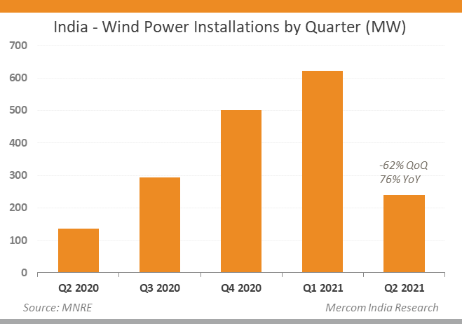 2021年第二季度,印度新增風電裝機容量239兆瓦,環比下降62%,一季度新增623兆瓦。與2020年第二季度的136 MW相比,同比增長了76%。