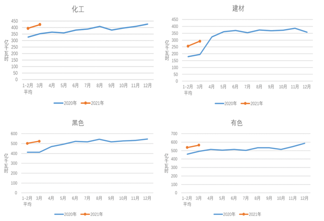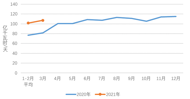 3月份,化工行業用電量424億千瓦時,同比增長13.6%,增速比上年同期提高15.6個百分點;建材行業用電量292億千瓦時,同比增長40.9%,增速比上年同期提高58.8個百分點;黑色金屬冶煉行業用電量524億千瓦時,同比增長26.2%,增速比上年同期提高32.1個百分點;有色金屬冶煉行業用電量565億千瓦時,同比增長11.4%,增速比上年同期提高6.8個百分點。