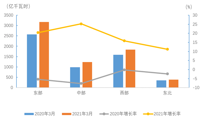3月份,東、中、西部和東北地區全社會用電量增速分別為20.4%、25.3%、15.8%和11.2%。
