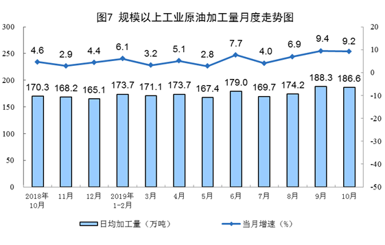10月份,加工原油5784萬噸,同比增長9.2%,增速比上月放緩0.2個百分點;日均加工186.6萬噸,環比減少1.7萬噸。1—10月份,加工原油53710萬噸,同比增長6.4%。